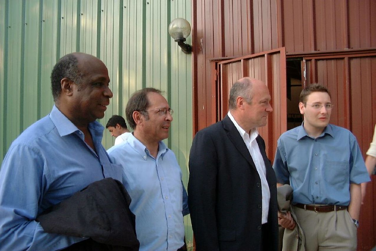 Bambouck Roger, (à gauche) ministre des sports de 1988 à 1991, le seul français à avoir détenu le record du monde du 100 m   ici en 2001 en Dordogne avec Michel  Moyrand et Alain Rousset (Président du conseil Régional d'Aquitaine à l'époque et toujours président du conseil régional de la nouvelle Aquitaine actuellement)