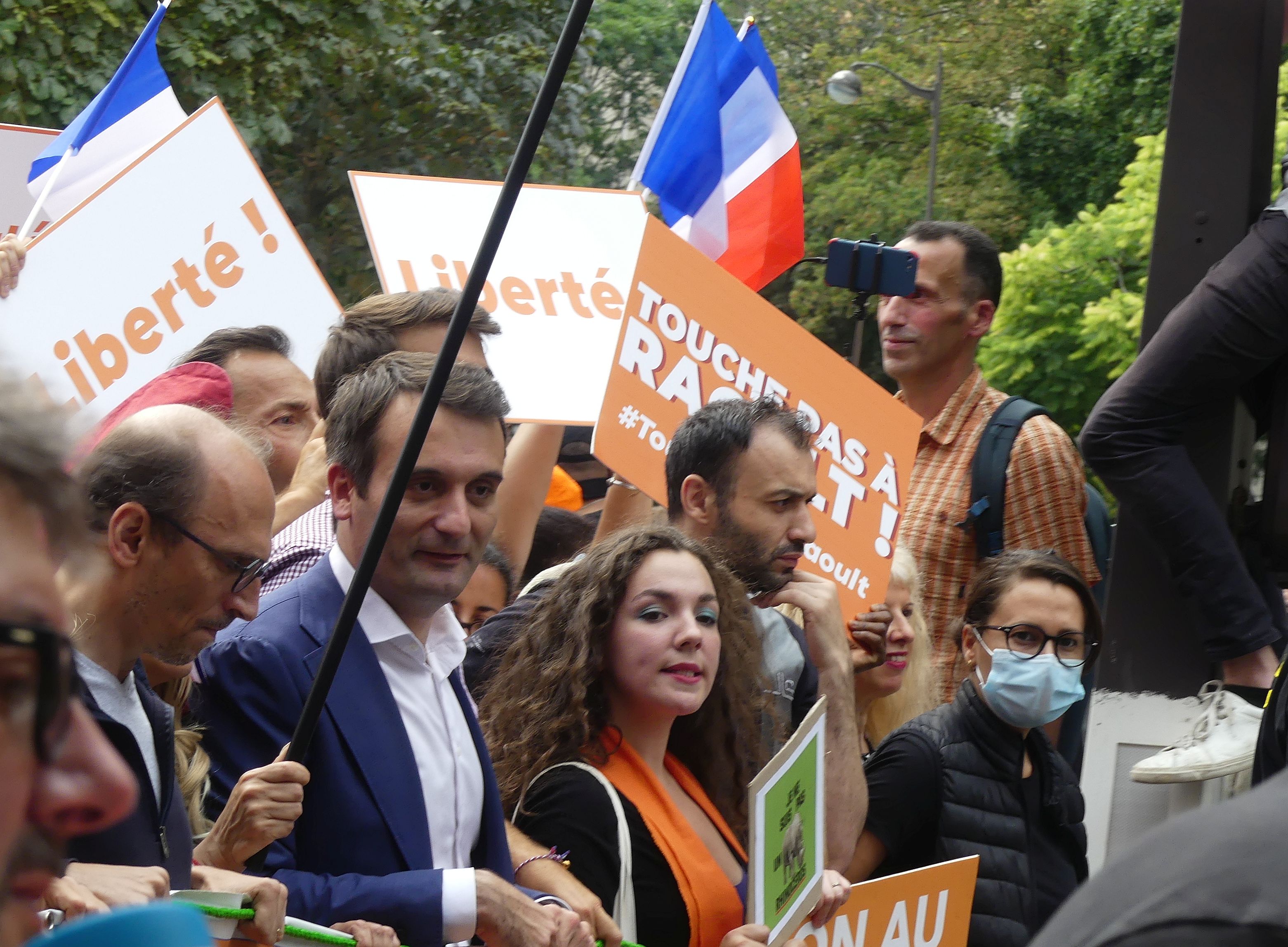 Di Vizio Fabrice , l'avocat polémiste à gauche de Florian Philippo  place Denfert Rochereau à une manif anti vax le 21 aout 2021