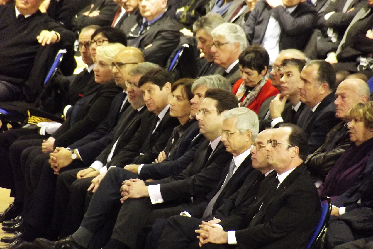 Cazeneuve Bernard  à la droite de François Hollande à Mont-de-Marsant le 25 mars 2017,  en hommage à Xavier Emmanueli, avec en autres Faure, Le Fol Rousset...